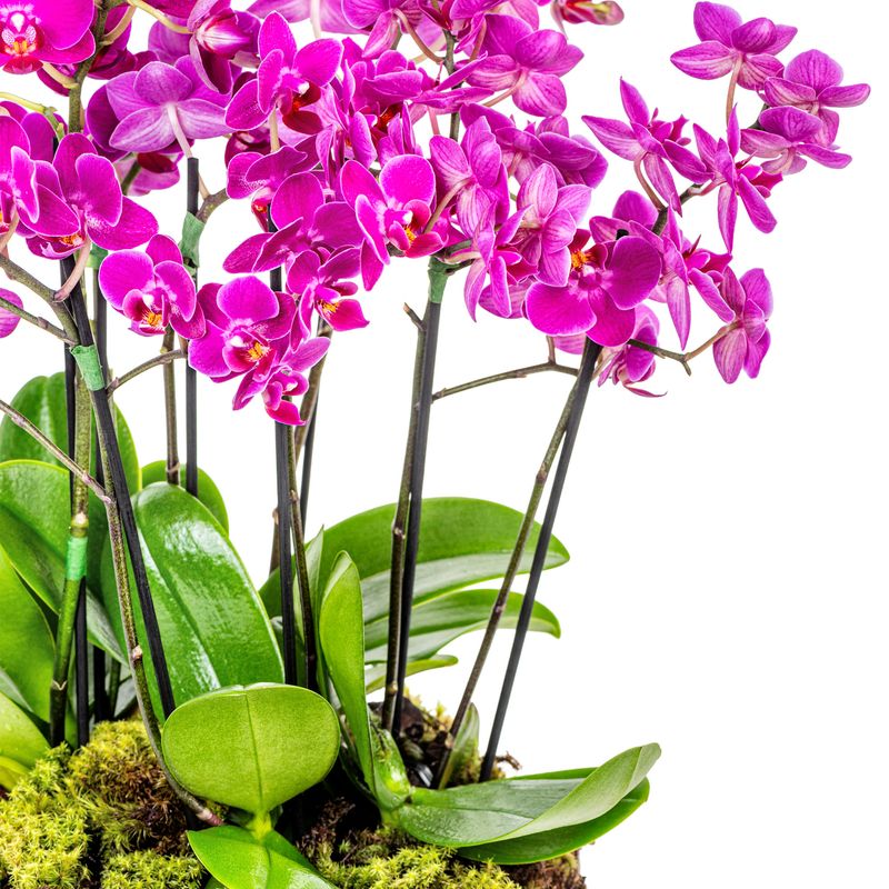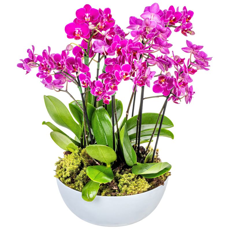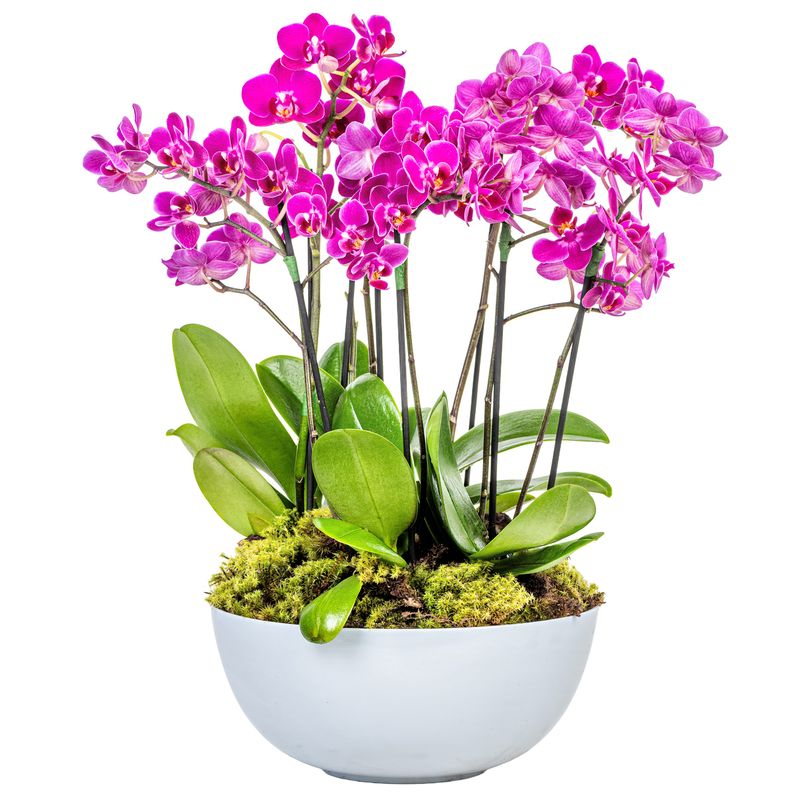 Arranjo em vaso branco de cerâmica com oito mini orquídeas rosa.