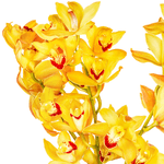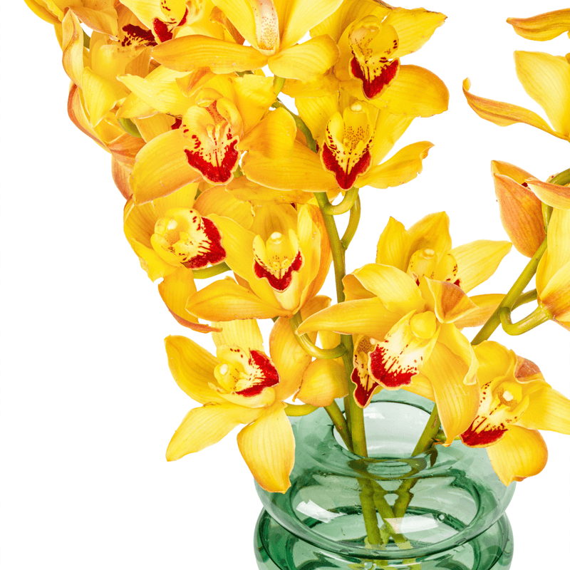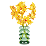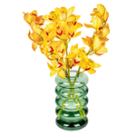 Arranjo em vaso de vidro verde com cymbidium amarelo.