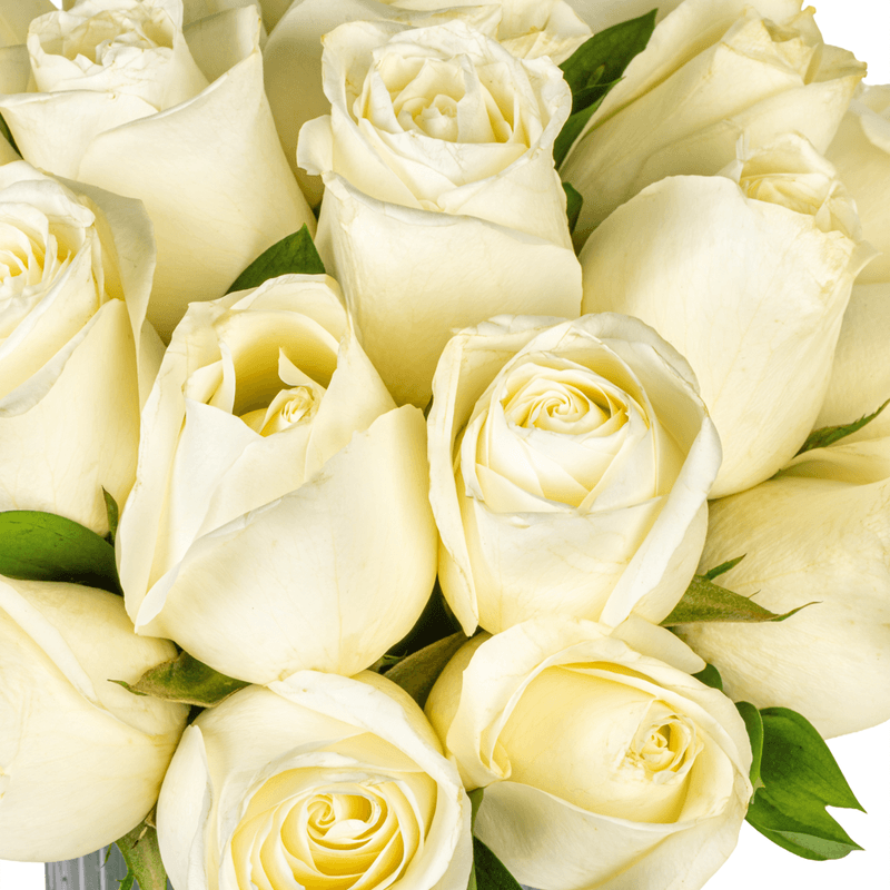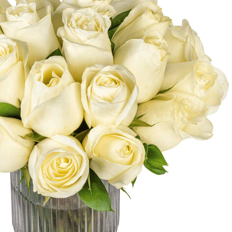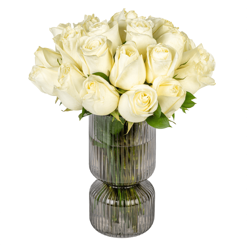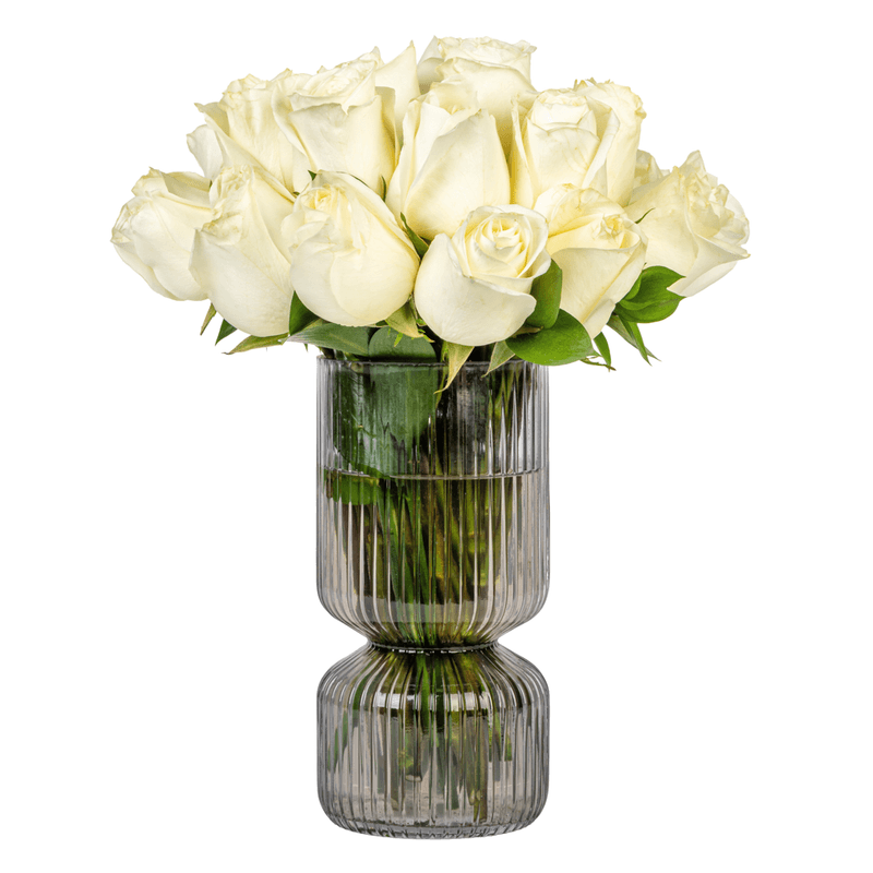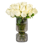 Arranjo em vaso de vidro cinza com rosa brancas premium.