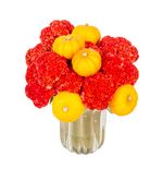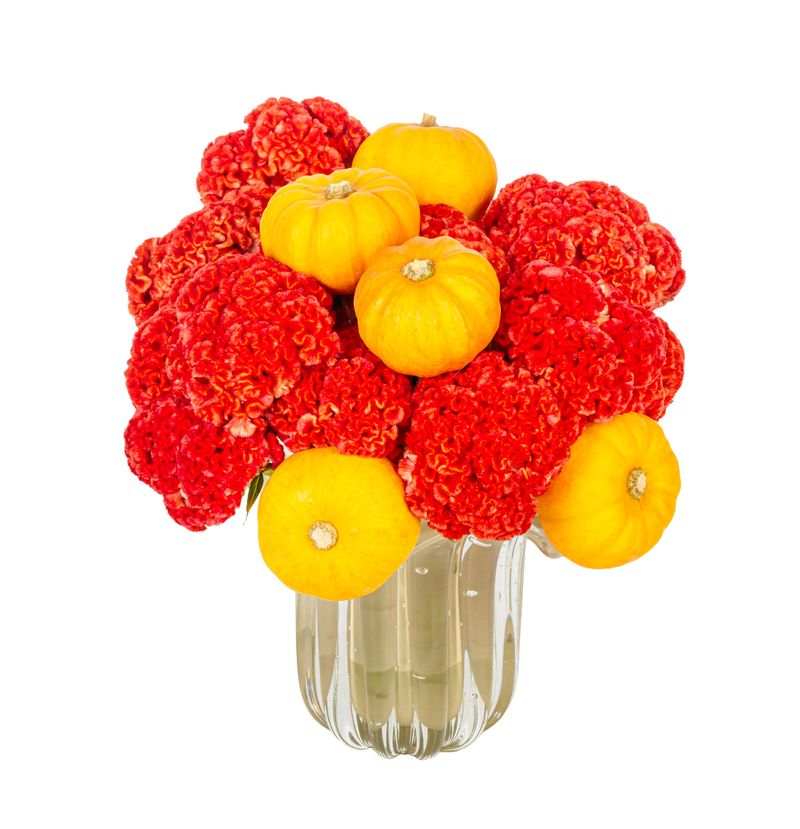 Arranjos em vaso de munano com celosia laranja e mini abóbora.