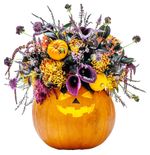 Arranjos em caixa em abóbora com mix de flores, callas negra, flor de dracena, anastasia ocre, escabiose vinho e mini abóbora.