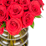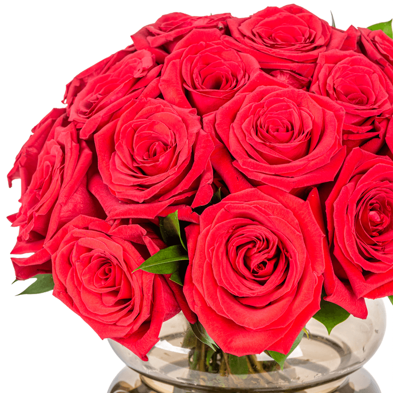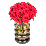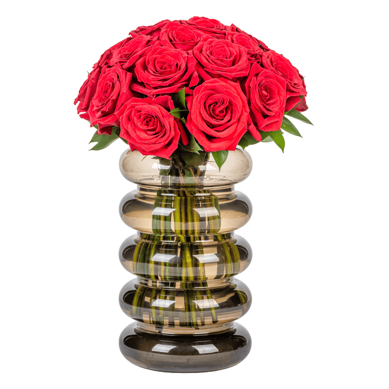 Arranjo em vaso de vidro marrom com rosa vermelha colombiana.