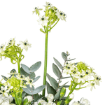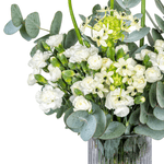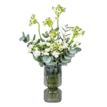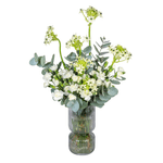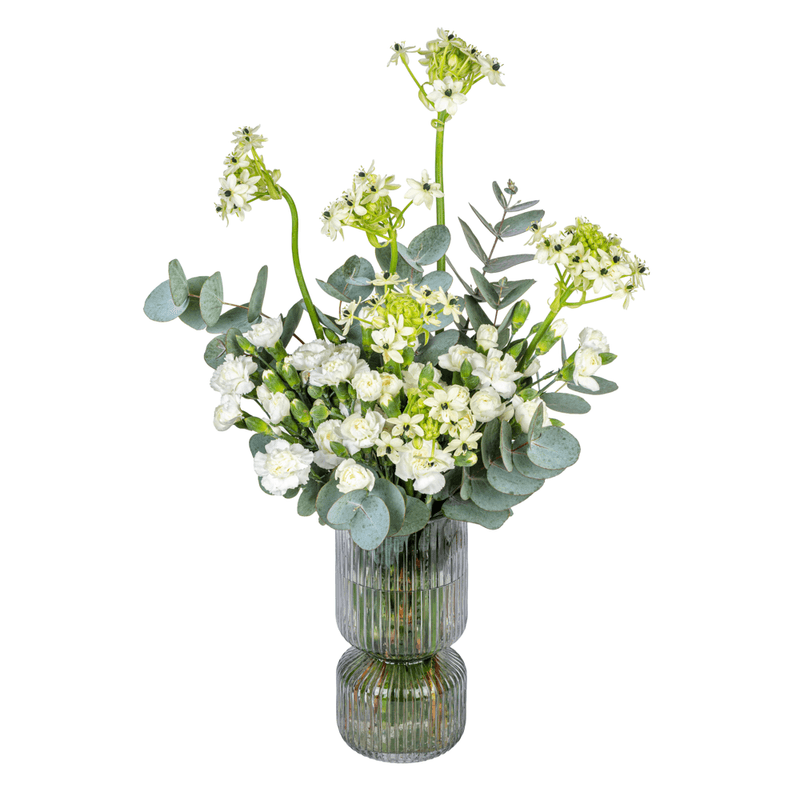 Arranjo em vaso de vidro cinza com mix de flores, ornitogalo, cravina branca e eucalipto.