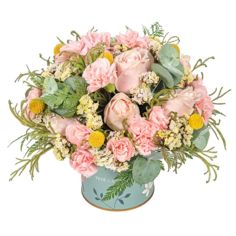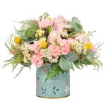 Arranjo em lata com mix de flores, rosa cor de rosa, cravina rosa, statice amarela, craspedia e folhagem.
