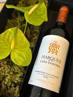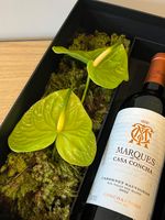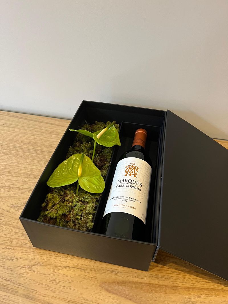 Presente sofisticado com vinho de qualidade, 2 antúrios e musgos naturais. Uma homenagem elegante para quem você mais ama.