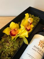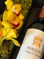 Presente sofisticado com vinho de qualidade, flor cymbidium e musgos naturais. Uma homenagem elegante para quem você mais ama.