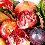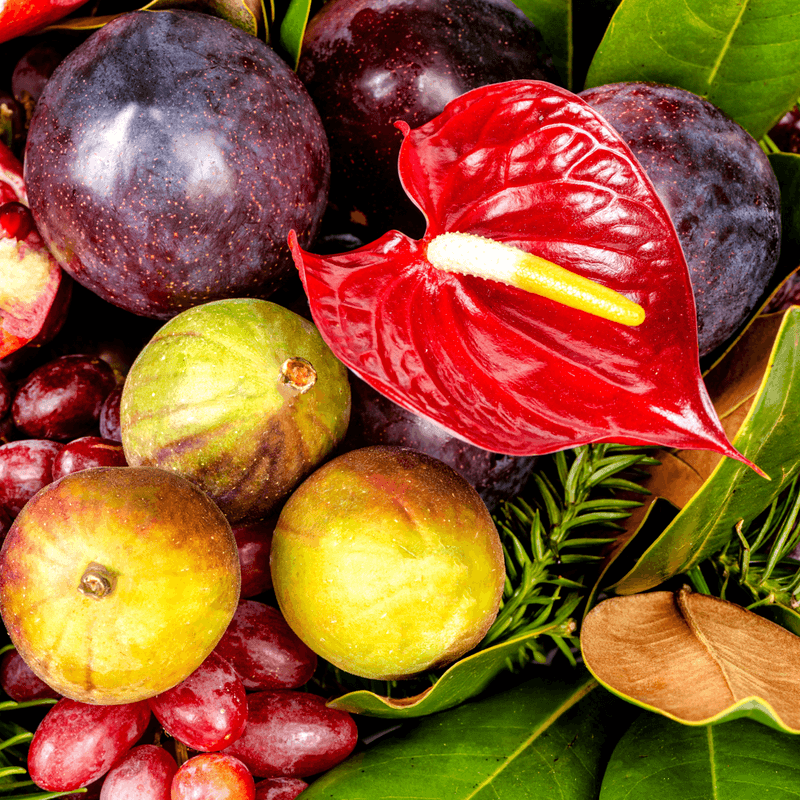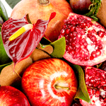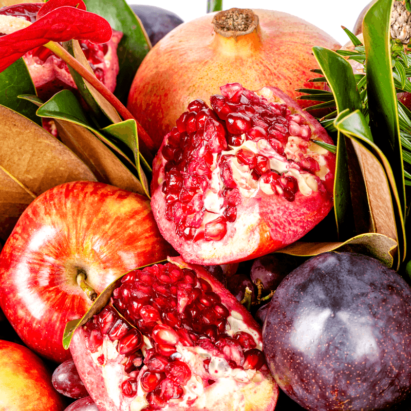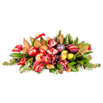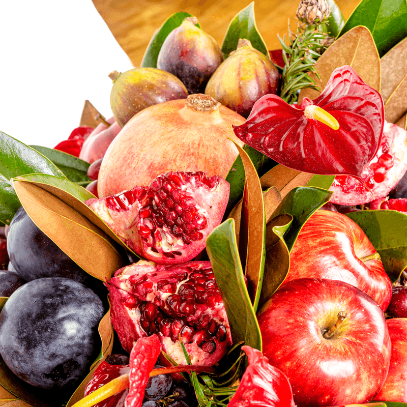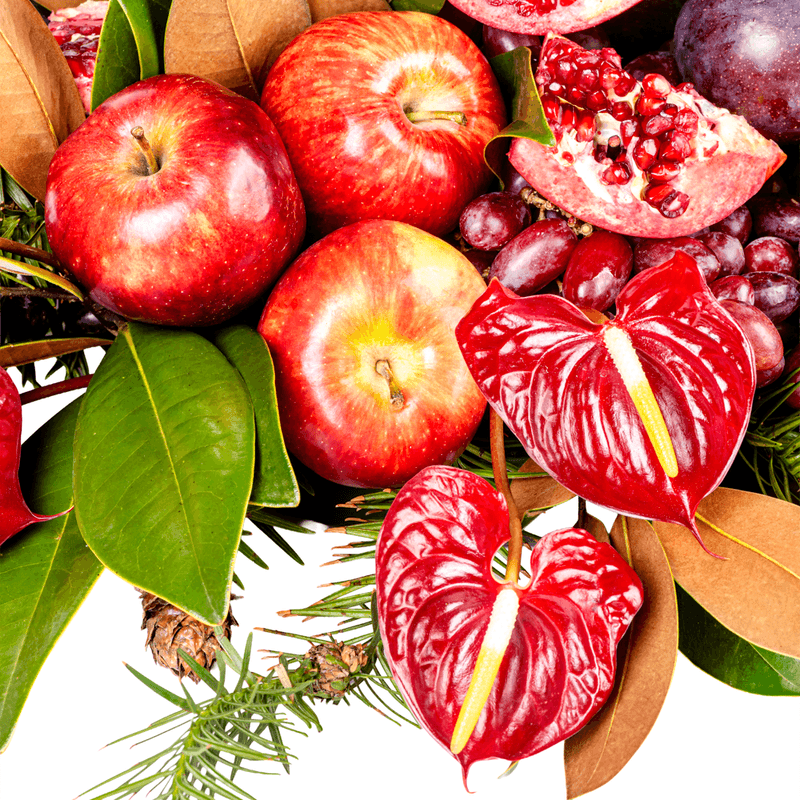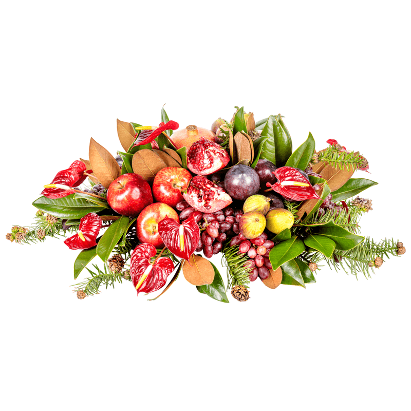 Centro de mesa com folhagem de pinha, folhas de magnólia, mini antúrios vermelhos, maçãs, figos, romãs e ameixas