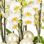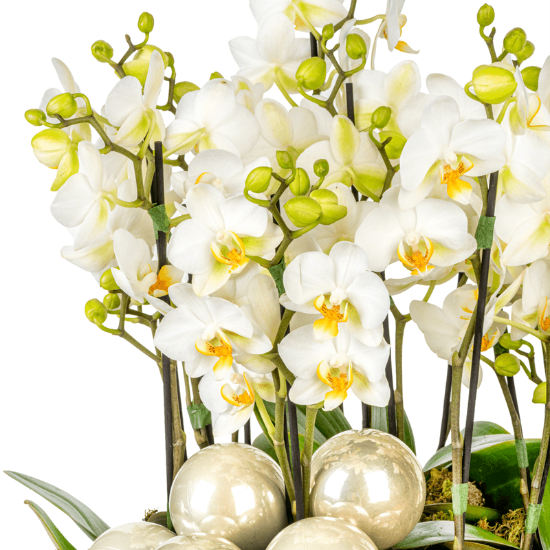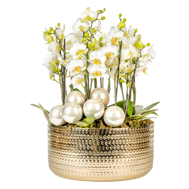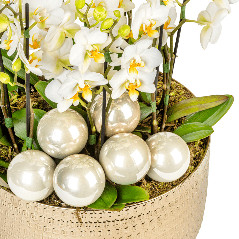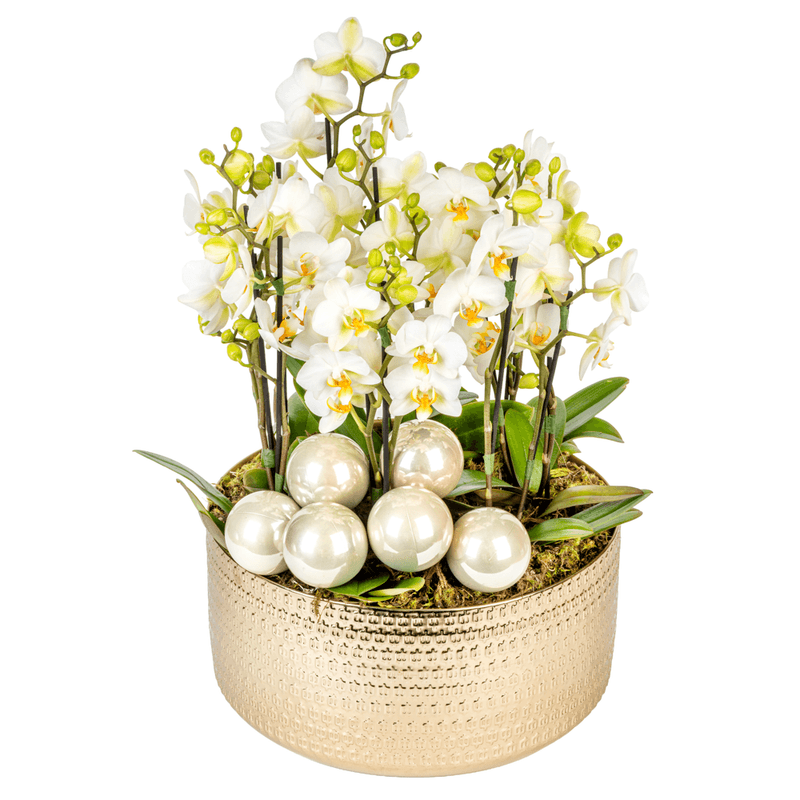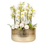 Cesta dourada com mini orquídeas brancas e bolas de Natal