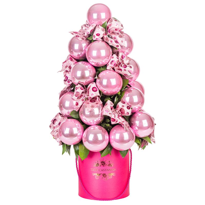 Arranjo em caixa redonda pink com bolas de natal, laços e folhagem de ruscus.