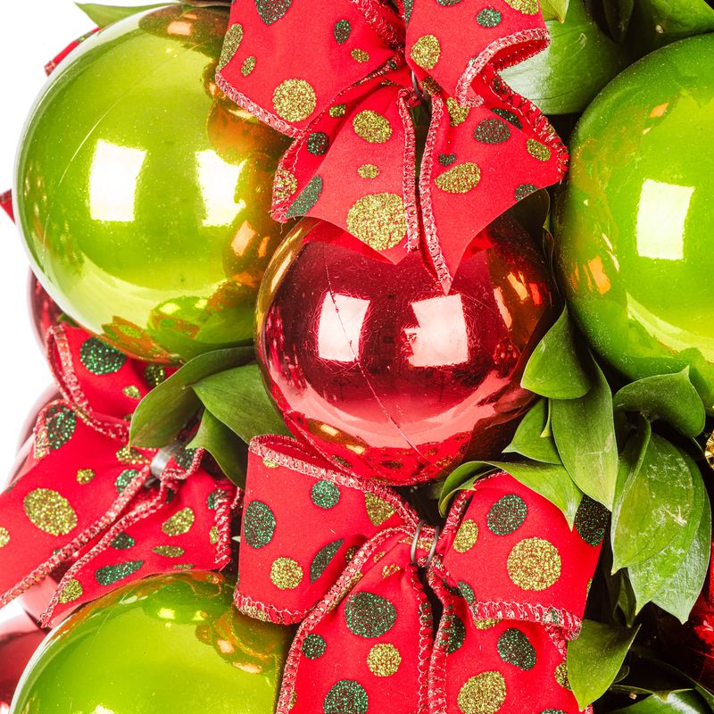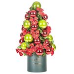 Arranjo em caixa redonda verde com bolas de natal, laços e folhagem de ruscus.