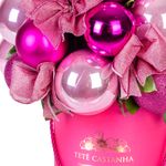 Arranjo em caixa redonda pink com bolas de natal, laços e folhagem de ruscus.