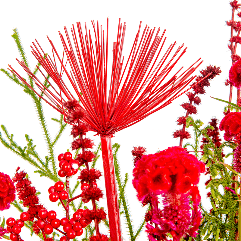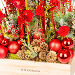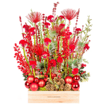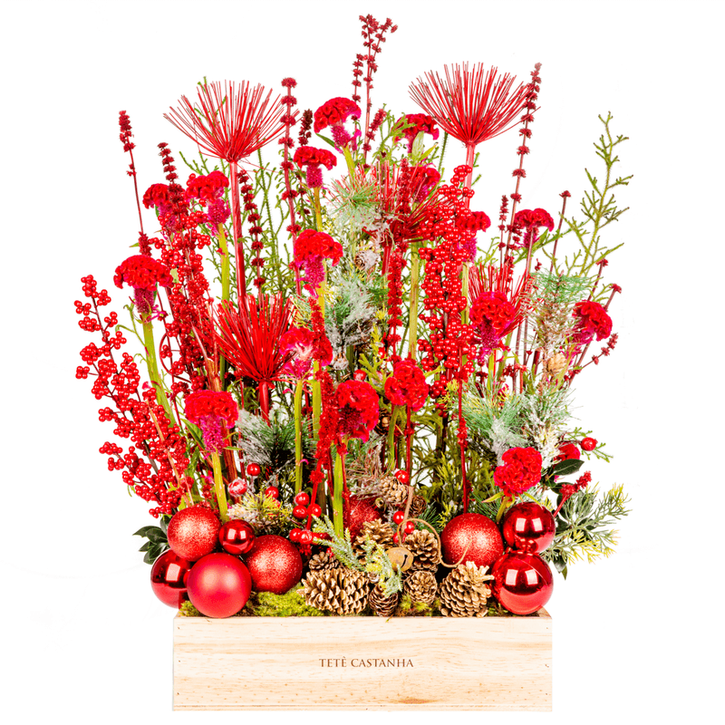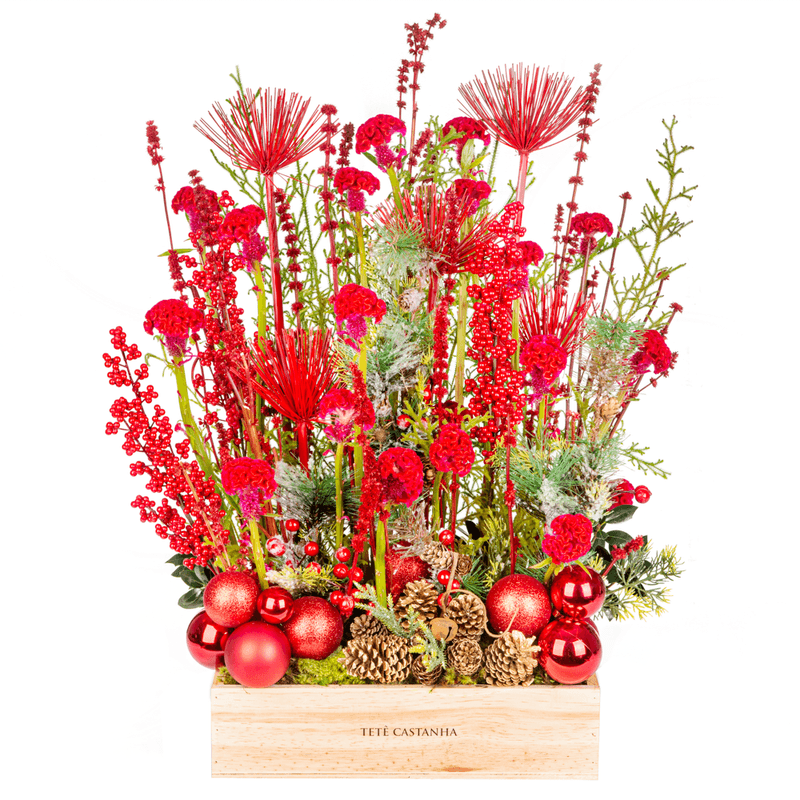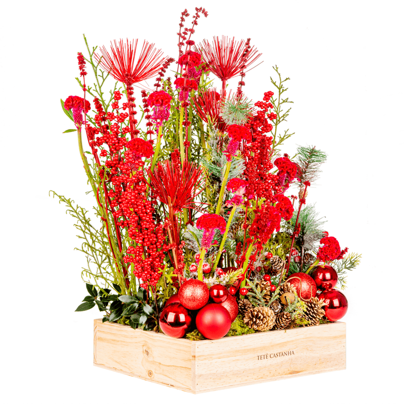 Arranjo em caixa de pinus com mix de flores vermelhas da estação.