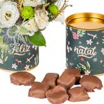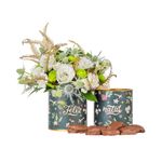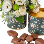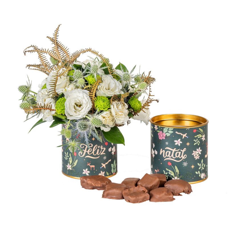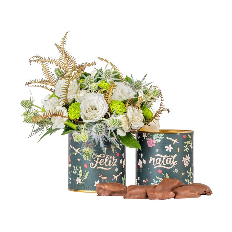 Arranjo em lata redonda verde com mix de flores, lisianthusn branco, pinórquio verde, erygium e latinhas com panetone.