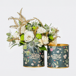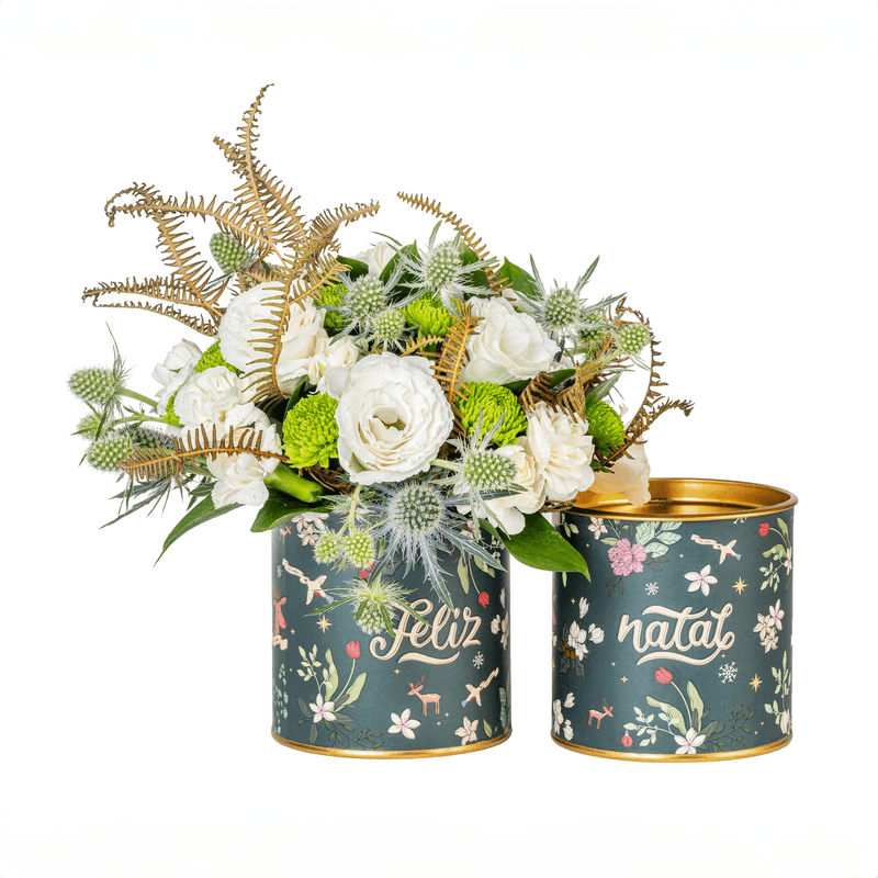 Arranjo em lata redonda verde com mix de flores, lisianthusn branco, pinórquio verde, erygium e latinhas com panetone.